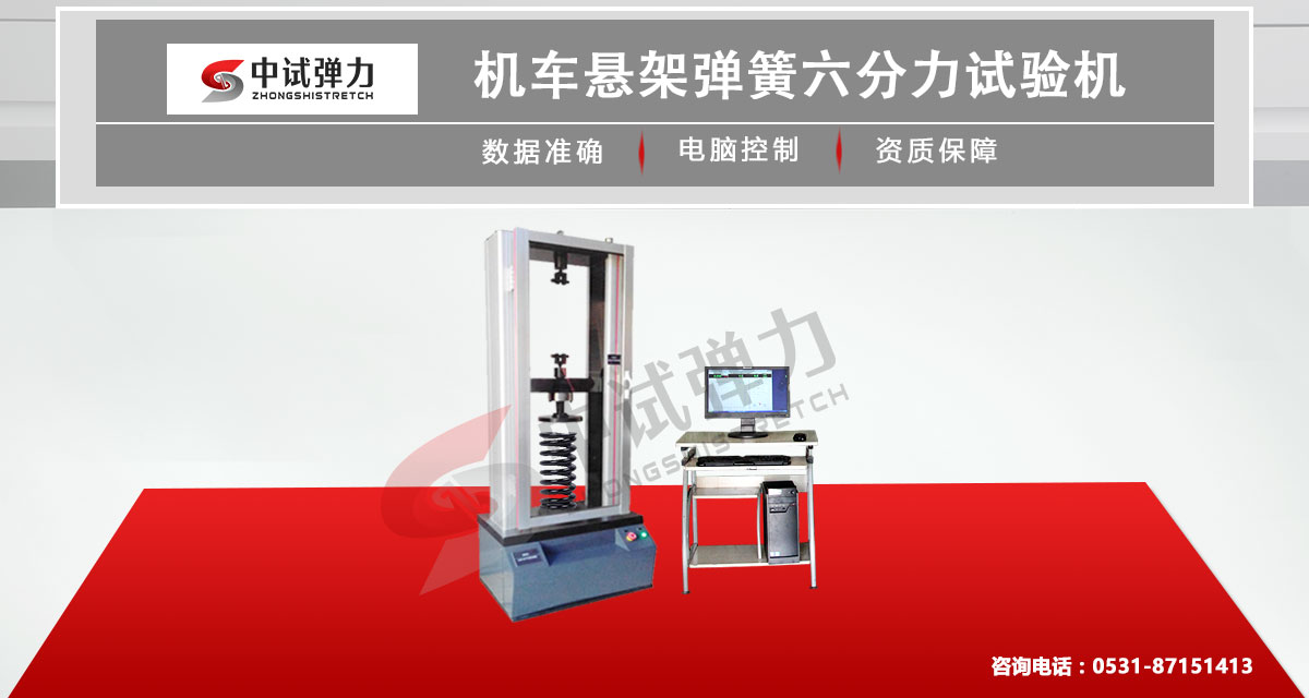 机车悬架弹簧六分力试验机,除了具有微机控制弹簧试验机的所有常规弹簧测试功能外,还配备了弹簧偏心力测试专用系统,能至少测试六个点轴向负荷,同时测出每个点上下端的x,y方向位置偏移(也叫载荷中心,单位:mm);每个点下端x,y方侧向力(单位:N),及侧向力矢量:R(单位:mm),能测试两个轴向刚度,并能显示刚度的曲线。