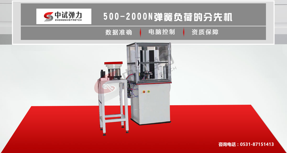 弹簧分选试验机采用气动加载,为配合弹簧生产流水线的节拍而设计高效的负荷检测设备,除了具有传统的负荷检测精度外,还具有快速分选的功能,可将合格区的弹簧的试验力分成强、次强、中、次弱、弱五段,分别由五个指示灯指示,测试完毕会在液晶屏上显示测试数据及测试结果(合格、合格+、合格-、不合格+、不合格-)。加载控制方式多变,有点动动作,单纯的上升下降功能;单循环功能,从加载到卸载自动进行,连续测试之间的节拍控制人工进行;多循环功能,试验速度可调,操作人员只需快速放取弹簧即可。解除了工人的劳动强度,并可进行班次检测数量统计,根据统计情况分析出问题的根结所在,这对传统的检测方法是一种极大的改善。本机并可进行疲劳试验。