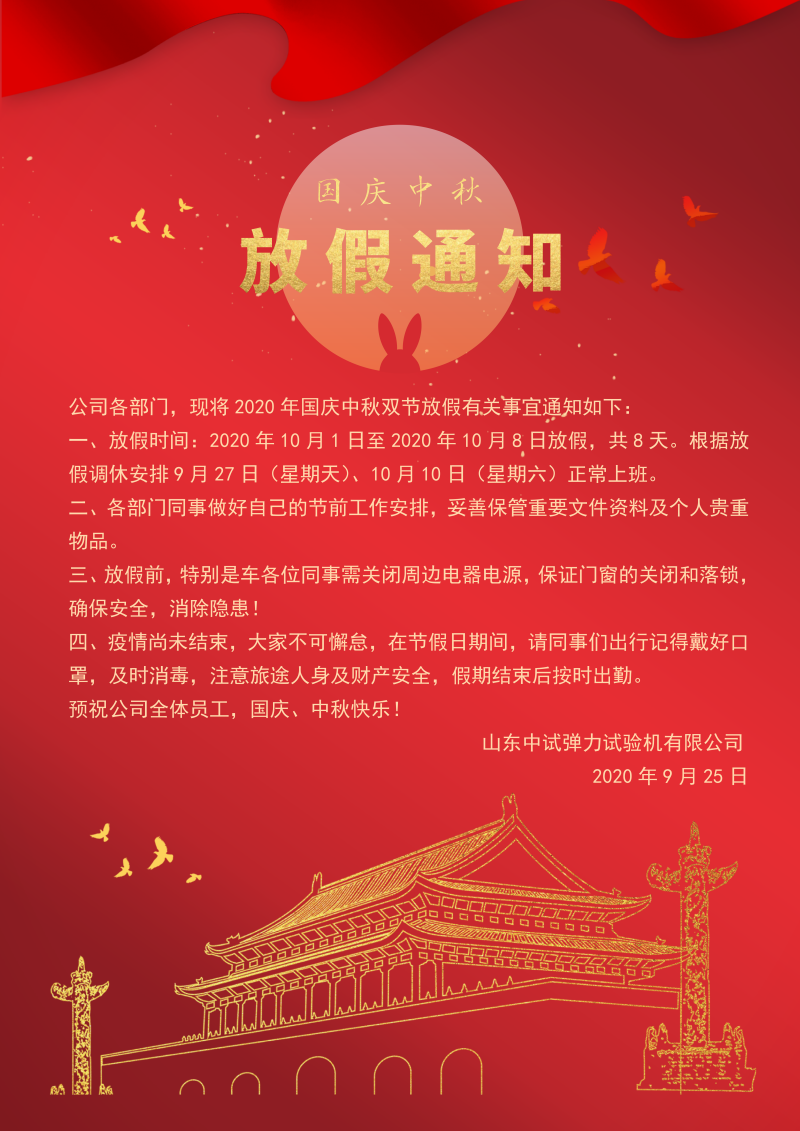 2020年中试国庆节中秋节双节放假通知,祝大家节日快乐,疫情尚未结束,防控不能松懈,出行戴好口罩,节后按时出勤!! !